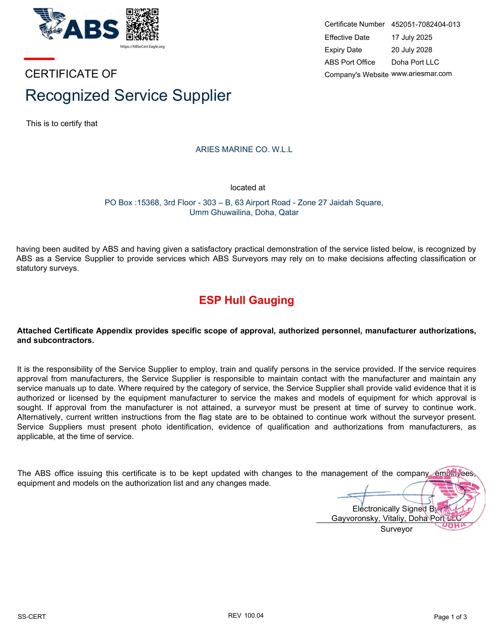 ABS Class Certificate - ESP Hull Guaging