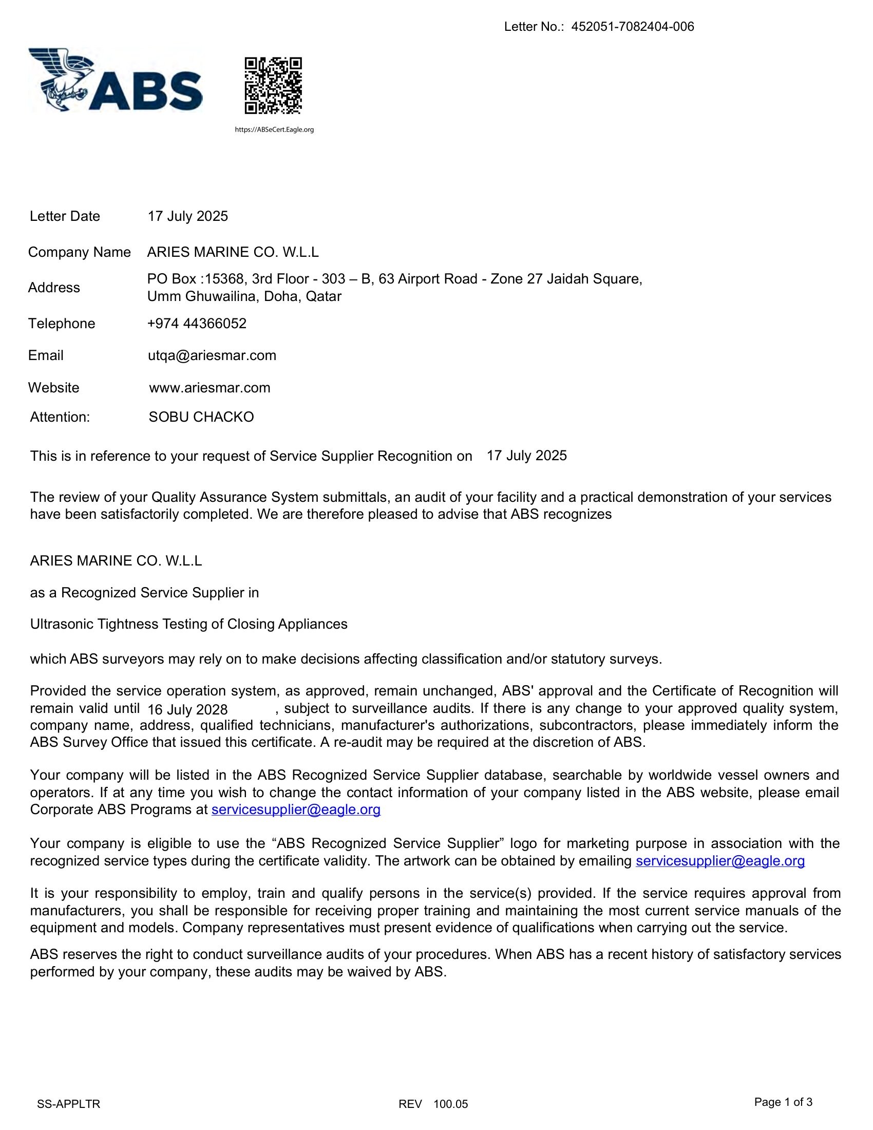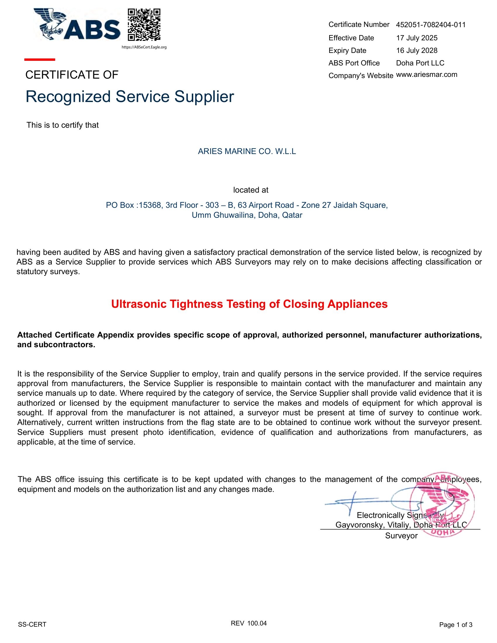 ABS Certificate_Aries Underwater Solutions LLC