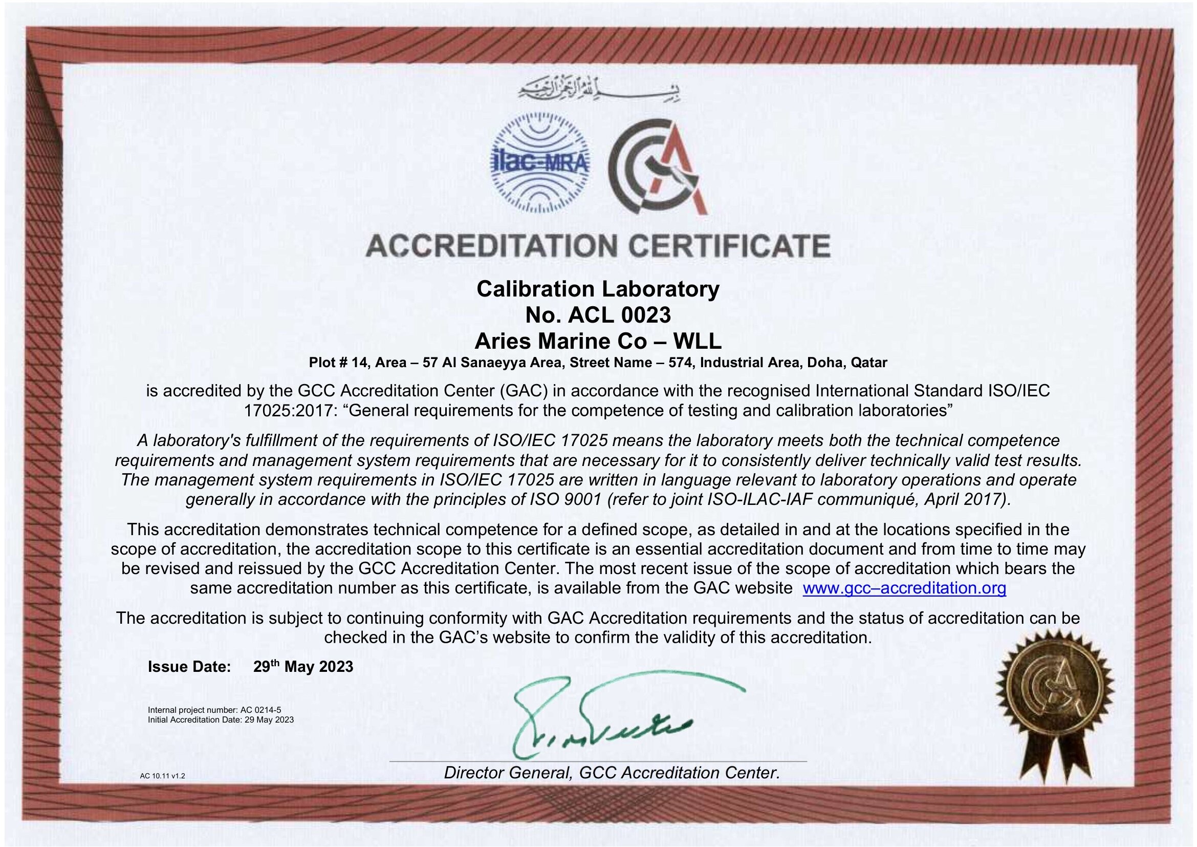 Accreditation certificate ACL 0023 - Qatar