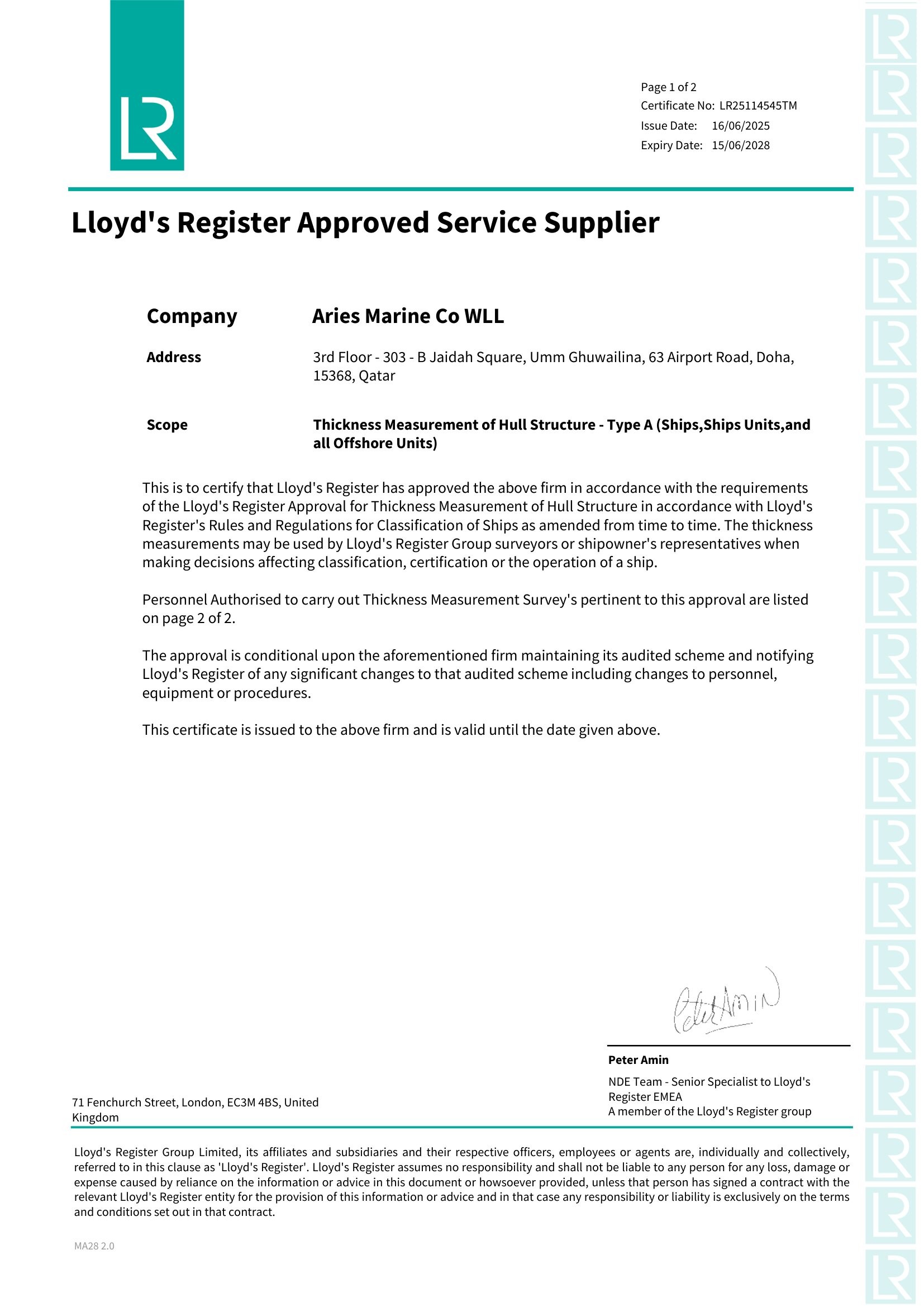 LR Class Certificate for Thickness Measurement of Hull Structure- Type A