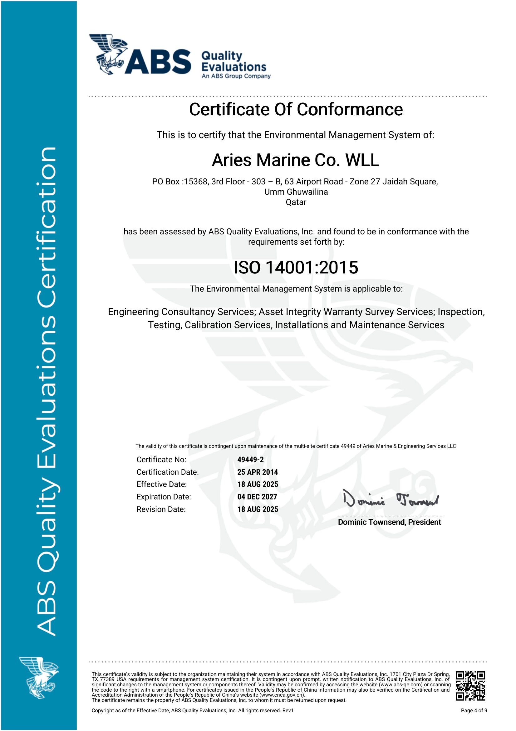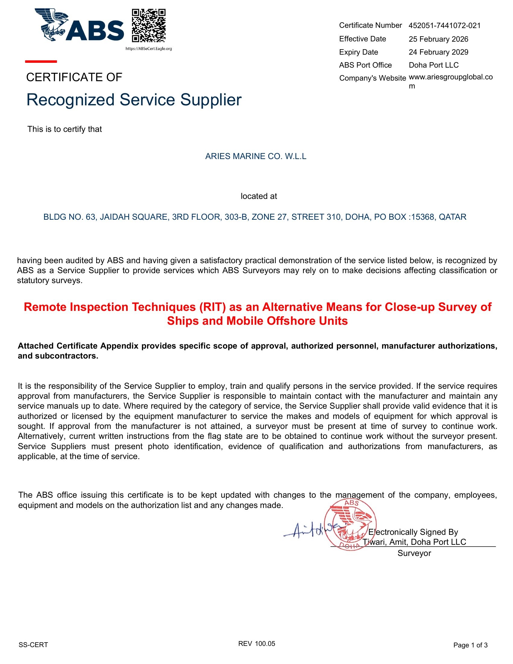 ABS Certificate_Aries Underwater Solutions LLC